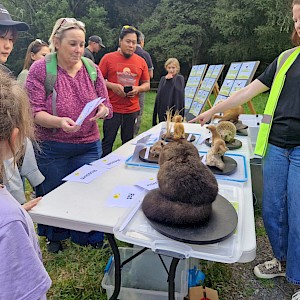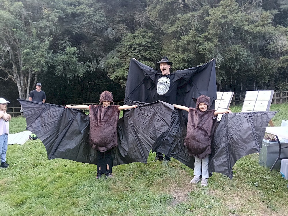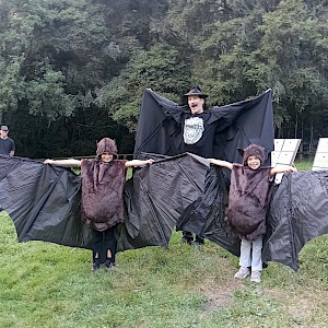 Local schools were invited to this free (ticketed) event. The weather thankfully was good and everyone enjoyed their picnics in the Log Hauler Site. Paul brought along some bat costumes, taxidermied pests (including a rat, weasel, stoat, hedgehog, possum and feral cat) as well as other educational aids. His entertaining presentation challenged the audience with questions about the pekapeka (long tailed bat) which is nationally critically threatened i.e. they are in danger of extinction if we do not protect them. This is why we need to protect them against predators – Paul pointed out captured feral cats have been found to have as many as 100 bats in their stomach!